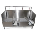 La station de nettoyage pour bottes (à droite) garantit un lavage optimal des semelles et de leurs bords grâce à l’action combinée des gicleurs et des trois brosses fixes. De petites buses de pulvérisation aspergent uniformément les poils et la chaussure. En frottant la botte contre les brosses inférieures et latérales, toutes les saletés sont éliminées, qu’il s’agisse des semelles, du profil ou des bords. La grille rehaussée sert de support pour le nettoyage des tiges de bottes à l’aide de la brosse manuelle alimentée en eau.