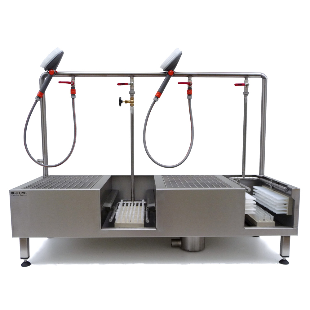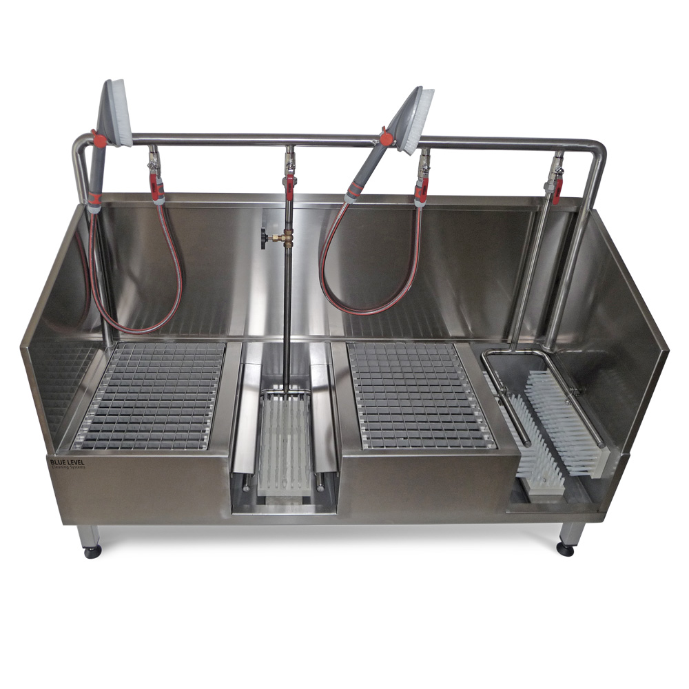 Les deux postes de lavage disposent d’une grille amovible surélevée servant de surface d’appui pour le nettoyage manuel des tiges de bottes et du dessus des chaussures de travail. Les bottes comme les chaussures peuvent ainsi être nettoyées en profondeur à l’aide des deux brosses manuelles aquifères incluses dans la livraison. Ces brosses peuvent également être utilisées pour le lavage à l’eau d’autres équipements.