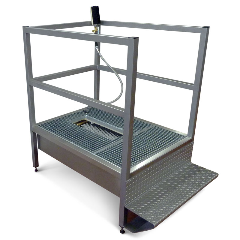 La cuve de ce lave-bottes est équipée de deux caillebotis galvanisés à chaud avec ouverture centrale. À l’avant se trouve une vanne d’arrêt automatique, actionnable facilement du pied. Les conduites latérales acheminent l’eau vers les brosses, tandis qu’une brosse manuelle en acier inoxydable, dotée d’une valve de fermeture rapide, permet de nettoyer manuellement les tiges de bottes ou d’autres équipements. Un avaloir intégré avec collecteur de boues et siphon, logé dans la cuve en inox, garantit une évacuation optimale de l’eau tout en séparant les saletés grossières. La grille avant amovible facilite le nettoyage ainsi que la vidange du siphon.