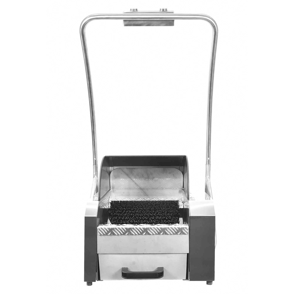 Une fois le moteur activé par les commandes ergonomiques, les chaussures sont pressées contre les brosses rotatives. Leurs poils en nylon spécialement conçus éliminent sans effort même les saletés les plus incrustées. Les impuretés sont recueillies dans un bac amovible situé sous la brosse.