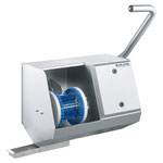 Le démarrage se fait par simple pression sur le bouton de contact au guidon. La brosse en nylon rotative, associée aux disques latéraux, permet un nettoyage complet des semelles et de leurs bords. Le large espace sous la brosse offre en outre la possibilité de nettoyer le cuir supérieur des chaussures. Les salissures sont collectées dans un tiroir extractible latéral, très simple à manipuler. L’ensemble de la construction en inox garantit une longue durée de vie, même dans des conditions intensives.